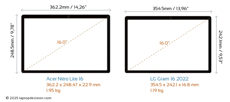 HDMIBoth Nitro Lite 16 and Gram 16 2022 feature an HDMI port. Nitro Lite 16 offers 1x HDMI 2.1, while Gram 16 2022 offers 1x HDMI 2.0.