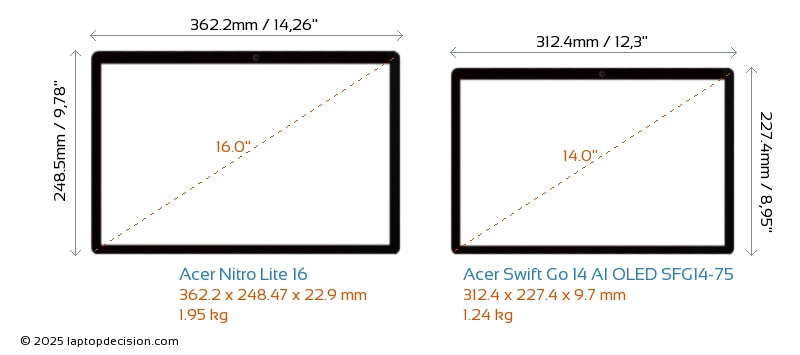 USBBoth Nitro Lite 16 and Swift Go 14 AI OLED SFG14-75 feature 2x USB 3.2 USB-A ports.Both Nitro Lite 16 and Swift Go 14 AI OLED SFG14-75 have USB Type-C ports. Nitro Lite 16 has 1x USB 4.0 USB Type-C ports, while Swift Go 14 AI OLED SFG14-75 has 2x USB 4.0 USB Type-C ports.