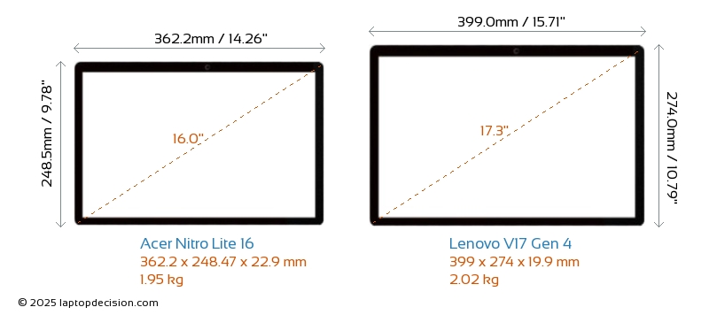 HDMIBoth Nitro Lite 16 and V17 Gen 4 feature an HDMI port. Nitro Lite 16 offers 1x HDMI 2.1, while V17 Gen 4 offers 1x HDMI 1.4.