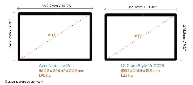 HDMI Nitro Lite 16 features an HDMI port (1x HDMI 2.1) for connecting to external monitors. Gram Style 16 2023 does not have an HDMI port.