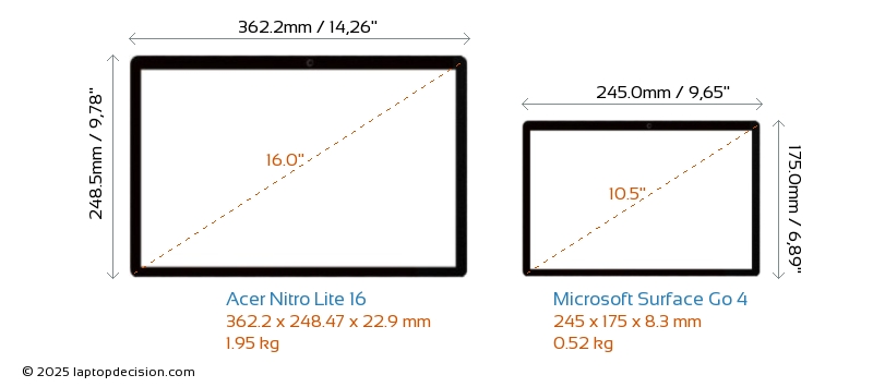 HDMI Nitro Lite 16 features an HDMI port (1x HDMI 2.1) for connecting to external monitors. Surface Go 4 does not have an HDMI port.