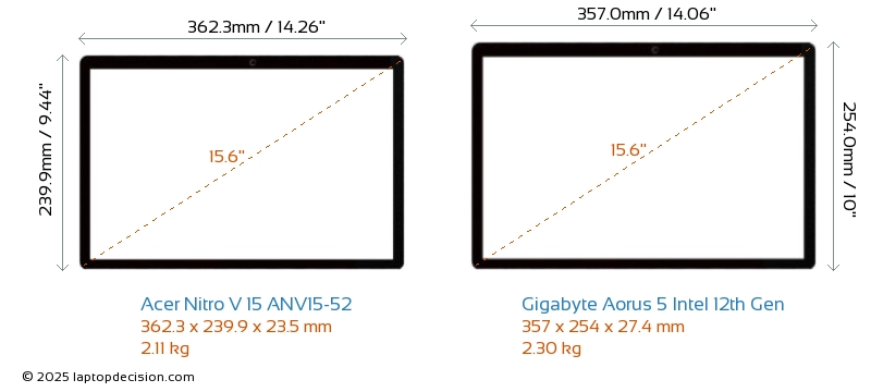 SD Card Reader Aorus 5 Intel 12th Gen is equipped with an SD Card Reader for easy access to memory cards. Nitro V 15 ANV15-52 does not have an SD Card Reader.