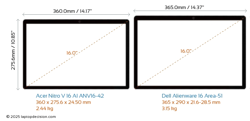 USBBoth Nitro V 16 AI ANV16-42 and Alienware 16 Area-51 feature 3x USB 3.2 USB-A ports.Both Nitro V 16 AI ANV16-42 and Alienware 16 Area-51 have USB Type-C ports. Nitro V 16 AI ANV16-42 has 1x USB 4.0 USB Type-C ports, while Alienware 16 Area-51 has 2x USB 4.0 USB Type-C ports.
