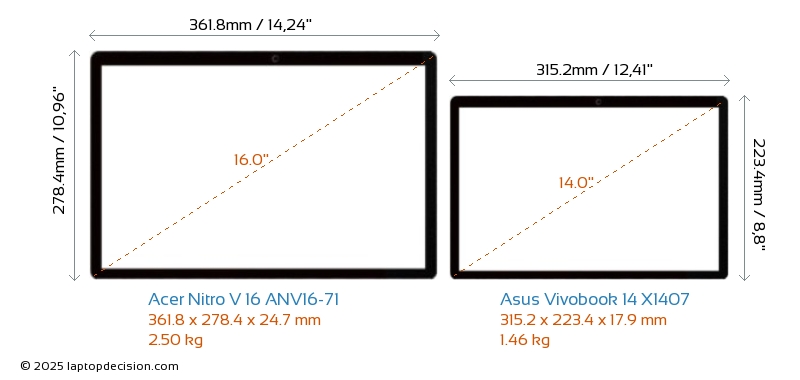HDMIBoth Nitro V 16 ANV16-71 and Vivobook 14 X1407 feature an HDMI port. Nitro V 16 ANV16-71 offers 1x HDMI 2.1, while Vivobook 14 X1407 offers 1x HDMI 1.4.