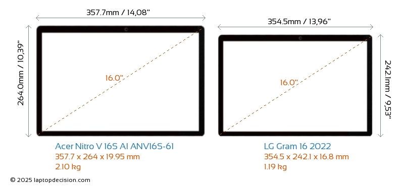 HDMIBoth Nitro V 16S AI ANV16S-61 and Gram 16 2022 feature an HDMI port. Nitro V 16S AI ANV16S-61 offers 1x HDMI 2.1, while Gram 16 2022 offers 1x HDMI 2.0.