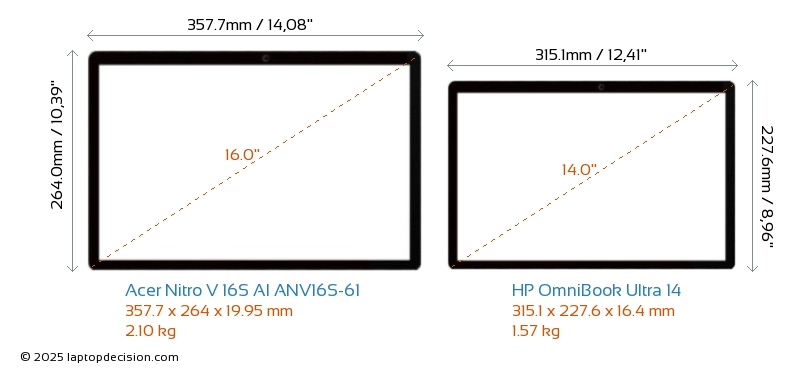 USBBoth Nitro V 16S AI ANV16S-61 and OmniBook Ultra 14 have USB-A ports. Nitro V 16S AI ANV16S-61 has 3x USB 3.2 USB-A ports, while OmniBook Ultra 14 has 1x USB 3.2 USB-A ports.Both Nitro V 16S AI ANV16S-61 and OmniBook Ultra 14 have USB Type-C ports. Nitro V 16S AI ANV16S-61 has 2x USB 4.0 USB Type-C ports, while OmniBook Ultra 14 has 3x USB 4.0 USB Type-C ports.