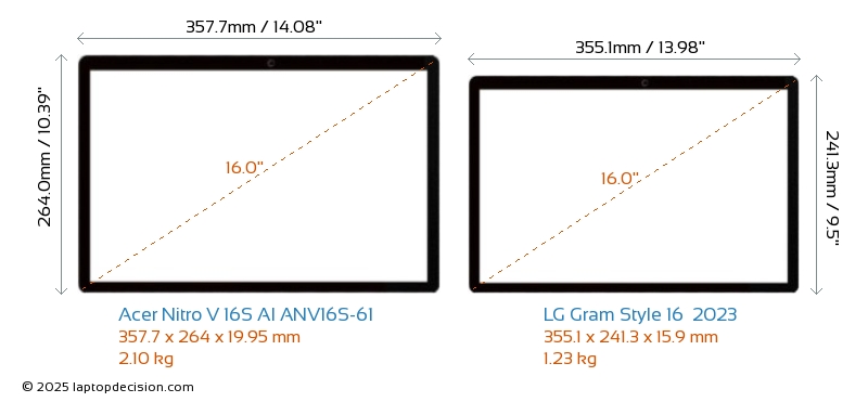 HDMI Nitro V 16S AI ANV16S-61 features an HDMI port (1x HDMI 2.1) for connecting to external monitors. Gram Style 16 2023 does not have an HDMI port.