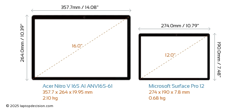 HDMI Nitro V 16S AI ANV16S-61 features an HDMI port (1x HDMI 2.1) for connecting to external monitors. Surface Pro 12 does not have an HDMI port.
