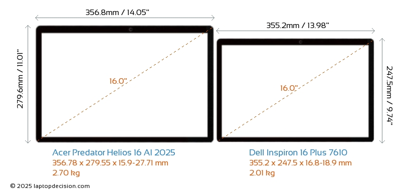 HDMIBoth Predator Helios 16 AI 2025 and Inspiron 16 Plus 7610 feature an HDMI port. Predator Helios 16 AI 2025 offers 1x HDMI 2.1, while Inspiron 16 Plus 7610 offers 1x HDMI 2.0.