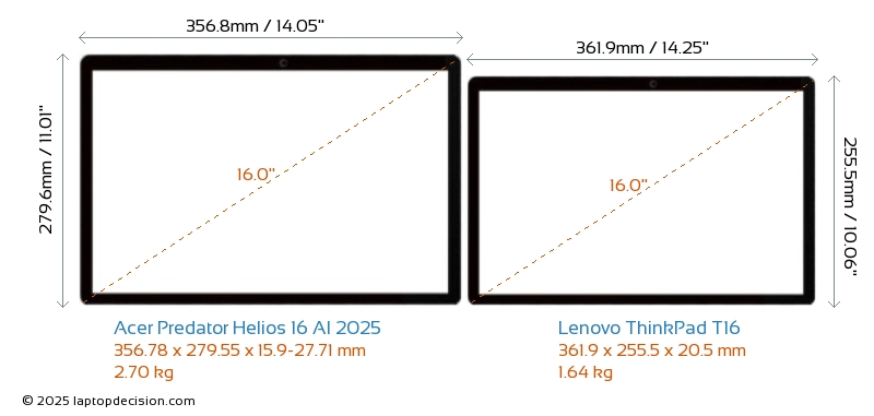 HDMIBoth Predator Helios 16 AI 2025 and ThinkPad T16 feature an HDMI port. Predator Helios 16 AI 2025 offers 1x HDMI 2.1, while ThinkPad T16 offers 1x HDMI 2.0.