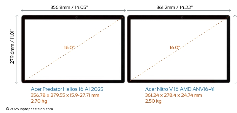 USBBoth Predator Helios 16 AI 2025 and Nitro V 16 AMD ANV16-41 have USB-A ports. Predator Helios 16 AI 2025 has 3x USB 3.2 USB-A ports, while Nitro V 16 AMD ANV16-41 has 2x USB 3.2 USB-A ports.Both Predator Helios 16 AI 2025 and Nitro V 16 AMD ANV16-41 have USB Type-C ports. Predator Helios 16 AI 2025 has 2x USB 4.0 USB Type-C ports, while Nitro V 16 AMD ANV16-41 has 1x USB 3.2 USB Type-C ports.