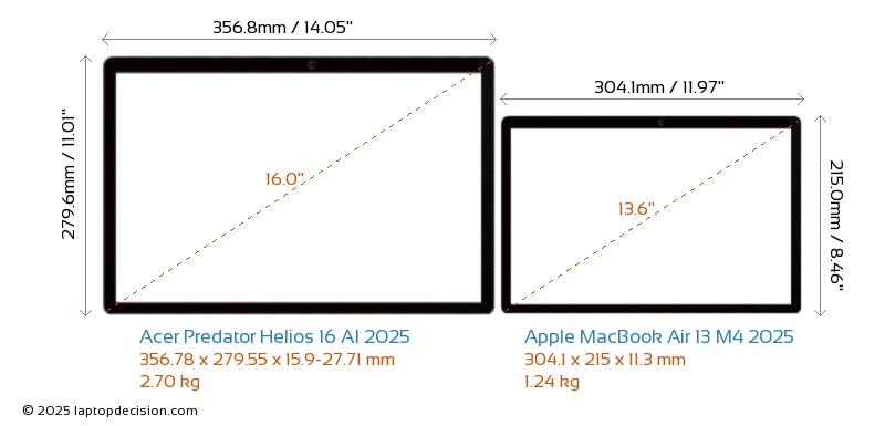 HDMI Predator Helios 16 AI 2025 features an HDMI port (1x HDMI 2.1) for connecting to external monitors. MacBook Air 13 M4 2025 does not have an HDMI port.