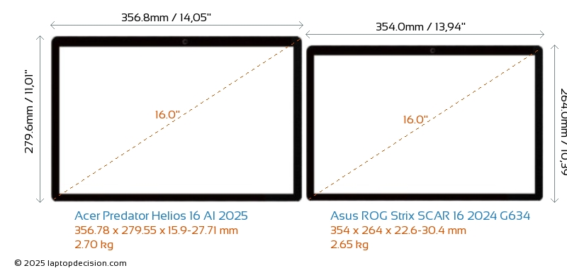 USBBoth Predator Helios 16 AI 2025 and ROG Strix SCAR 16 2024 G634 have USB-A ports. Predator Helios 16 AI 2025 has 3x USB 3.2 USB-A ports, while ROG Strix SCAR 16 2024 G634 has 2x USB 3.2 USB-A ports.Both Predator Helios 16 AI 2025 and ROG Strix SCAR 16 2024 G634 have USB Type-C ports. Predator Helios 16 AI 2025 has 2x USB 4.0 USB Type-C ports, while ROG Strix SCAR 16 2024 G634 has 2x USB 3.2 USB Type-C ports.
