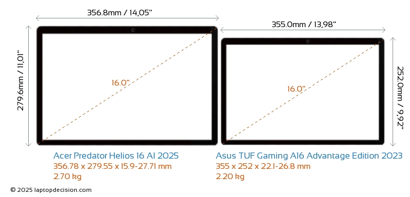 HDMIBoth Predator Helios 16 AI 2025 and TUF Gaming A16 Advantage Edition 2023 feature an HDMI port (1x HDMI 2.1) for connecting to external monitors.