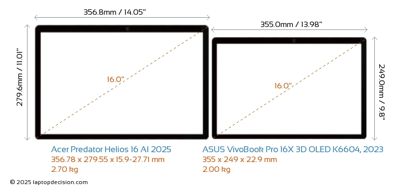 HDMIBoth Predator Helios 16 AI 2025 and VivoBook Pro 16X 3D OLED K6604, 2023 feature an HDMI port (1x HDMI 2.1) for connecting to external monitors.