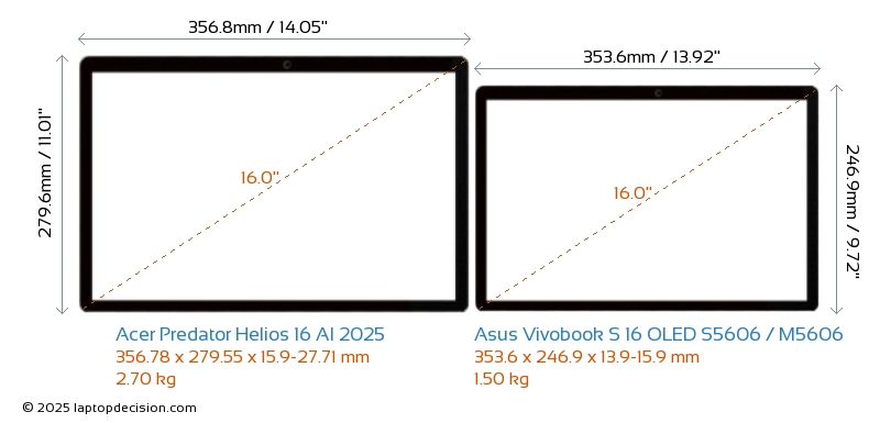 Wifi Predator Helios 16 AI 2025 features a more advanced Wi-Fi standard v7, providing faster and more reliable wireless connections compared to Vivobook S 16 OLED S5606 / M5606 (v6E).