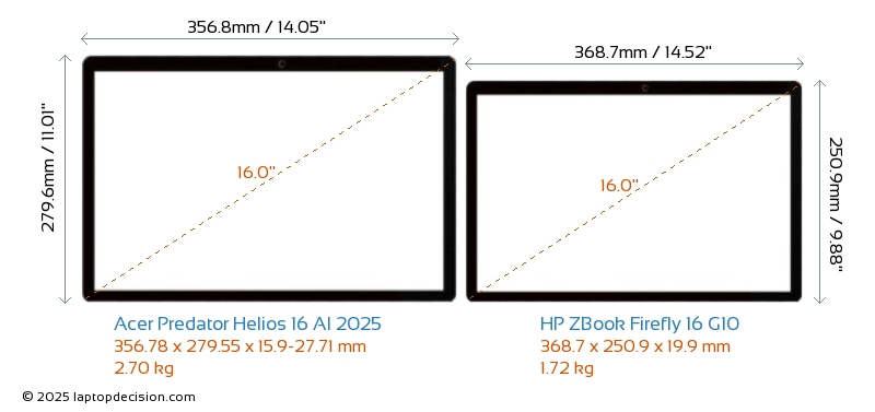 HDMIBoth Predator Helios 16 AI 2025 and ZBook Firefly 16 G10 feature an HDMI port. Predator Helios 16 AI 2025 offers 1x HDMI 2.1, while ZBook Firefly 16 G10 offers 1x HDMI 2.0.