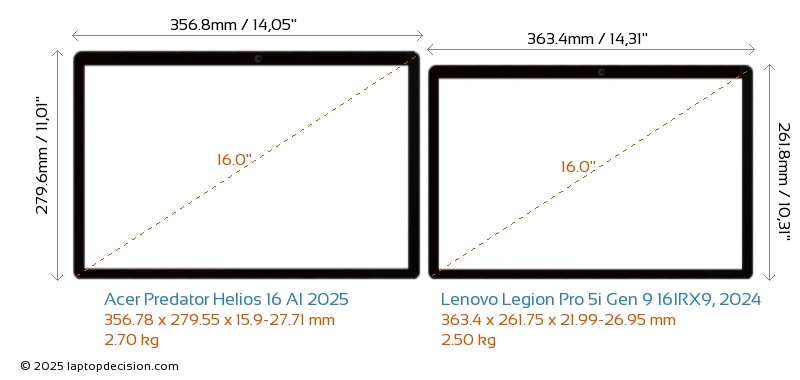 USBBoth Predator Helios 16 AI 2025 and Legion Pro 5i Gen 9 16IRX9, 2024 have USB-A ports. Predator Helios 16 AI 2025 has 3x USB 3.2 USB-A ports, while Legion Pro 5i Gen 9 16IRX9, 2024 has 4x USB 3.2 USB-A ports.Both Predator Helios 16 AI 2025 and Legion Pro 5i Gen 9 16IRX9, 2024 have USB Type-C ports. Predator Helios 16 AI 2025 has 2x USB 4.0 USB Type-C ports, while Legion Pro 5i Gen 9 16IRX9, 2024 has 2x USB 3.2 USB Type-C ports.