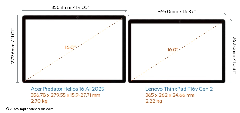 ThunderboltBoth Predator Helios 16 AI 2025 and ThinkPad P16v Gen 2 feature Thunderbolt ports. Predator Helios 16 AI 2025 has Thunderbolt 5, while ThinkPad P16v Gen 2 has Thunderbolt 4.
