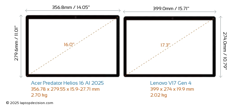 HDMIBoth Predator Helios 16 AI 2025 and V17 Gen 4 feature an HDMI port. Predator Helios 16 AI 2025 offers 1x HDMI 2.1, while V17 Gen 4 offers 1x HDMI 1.4.