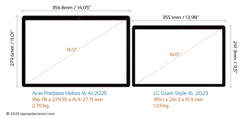 HDMI Predator Helios 16 AI 2025 features an HDMI port (1x HDMI 2.1) for connecting to external monitors. Gram Style 16 2023 does not have an HDMI port.