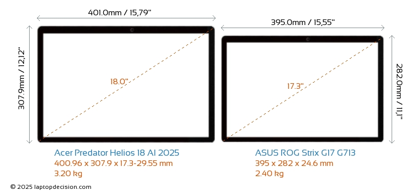 HDMIBoth Predator Helios 18 AI 2025 and ROG Strix G17 G713 feature an HDMI port. Predator Helios 18 AI 2025 offers 1x HDMI 2.1, while ROG Strix G17 G713 offers 1x HDMI 2.0.