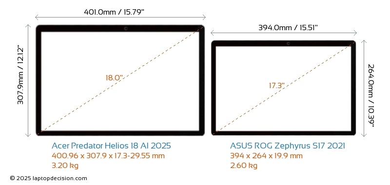 HDMIBoth Predator Helios 18 AI 2025 and ROG Zephyrus S17 2021 feature an HDMI port. Predator Helios 18 AI 2025 offers 1x HDMI 2.1, while ROG Zephyrus S17 2021 offers 1x HDMI 2.0.