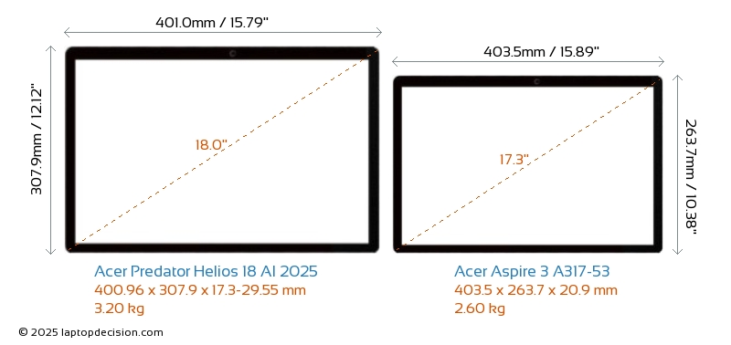 SD Card Reader Predator Helios 18 AI 2025 is equipped with an SD Card Reader for easy access to memory cards. Aspire 3 A317-53 does not have an SD Card Reader.