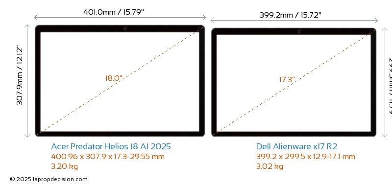 USBBoth Predator Helios 18 AI 2025 and Alienware x17 R2 have USB-A ports. Predator Helios 18 AI 2025 has 3x USB 3.2 USB-A ports, while Alienware x17 R2 has 2x USB 3.2 USB-A ports.Both Predator Helios 18 AI 2025 and Alienware x17 R2 have USB Type-C ports. Predator Helios 18 AI 2025 has 2x USB 4.0 USB Type-C ports, while Alienware x17 R2 has 2x USB 3.2 USB Type-C ports.