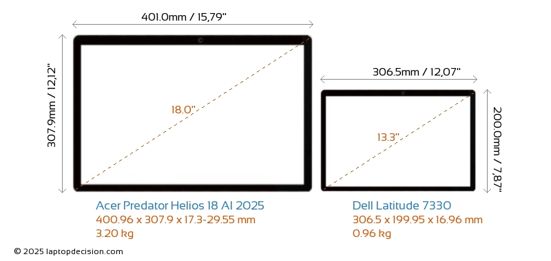 HDMIBoth Predator Helios 18 AI 2025 and Latitude 7330 feature an HDMI port. Predator Helios 18 AI 2025 offers 1x HDMI 2.1, while Latitude 7330 offers 1x HDMI 2.0.