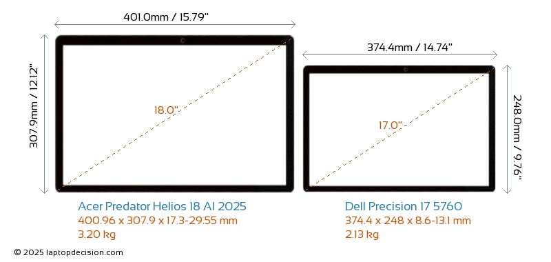 HDMI Predator Helios 18 AI 2025 features an HDMI port (1x HDMI 2.1) for connecting to external monitors. Precision 17 5760 does not have an HDMI port.