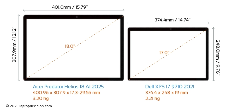 HDMI Predator Helios 18 AI 2025 features an HDMI port (1x HDMI 2.1) for connecting to external monitors. XPS 17 9710 2021 does not have an HDMI port.