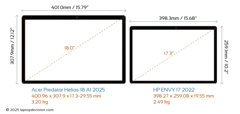 USBBoth Predator Helios 18 AI 2025 and ENVY 17 2022 feature 3x USB 3.2 USB-A ports.Both Predator Helios 18 AI 2025 and ENVY 17 2022 feature 2x USB 4.0 USB Type-C ports.