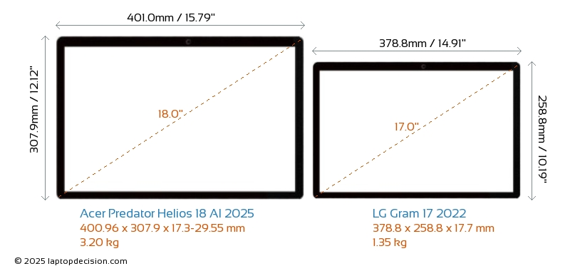 HDMIBoth Predator Helios 18 AI 2025 and Gram 17 2022 feature an HDMI port. Predator Helios 18 AI 2025 offers 1x HDMI 2.1, while Gram 17 2022 offers 1x HDMI 2.0.