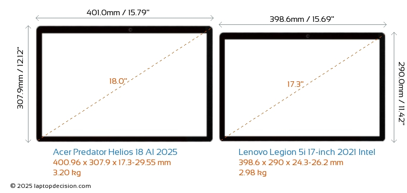 USBBoth Predator Helios 18 AI 2025 and Legion 5i 17-inch 2021 Intel feature 3x USB 3.2 USB-A ports.Both Predator Helios 18 AI 2025 and Legion 5i 17-inch 2021 Intel have USB Type-C ports. Predator Helios 18 AI 2025 has 2x USB 4.0 USB Type-C ports, while Legion 5i 17-inch 2021 Intel has 3x USB 3.2 USB Type-C ports.