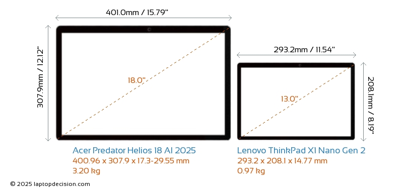 HDMI Predator Helios 18 AI 2025 features an HDMI port (1x HDMI 2.1) for connecting to external monitors. ThinkPad X1 Nano Gen 2 does not have an HDMI port.