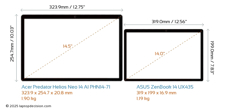 HDMIBoth Predator Helios Neo 14 AI PHN14-71 and ZenBook 14 UX435 feature an HDMI port. Predator Helios Neo 14 AI PHN14-71 offers 1x HDMI 2.1, while ZenBook 14 UX435 offers 1x HDMI 2.0.