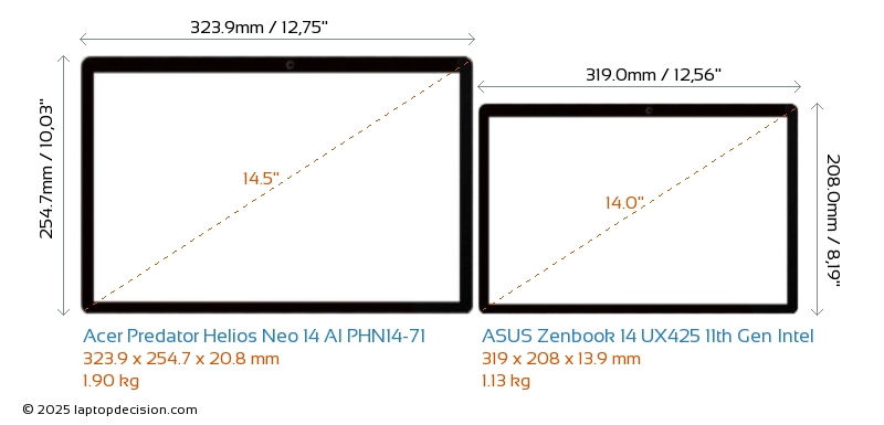 HDMIBoth Predator Helios Neo 14 AI PHN14-71 and Zenbook 14 UX425 11th Gen Intel feature an HDMI port. Predator Helios Neo 14 AI PHN14-71 offers 1x HDMI 2.1, while Zenbook 14 UX425 11th Gen Intel offers 1x HDMI 2.0.