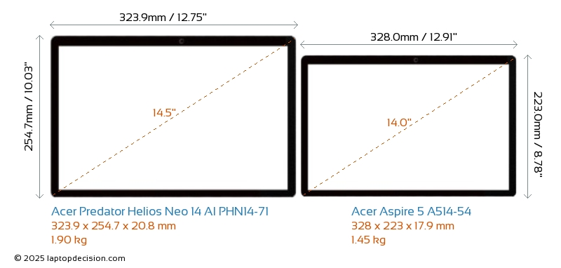 HDMIBoth Predator Helios Neo 14 AI PHN14-71 and Aspire 5 A514-54 feature an HDMI port. Predator Helios Neo 14 AI PHN14-71 offers 1x HDMI 2.1, while Aspire 5 A514-54 offers 1x HDMI 2.0.