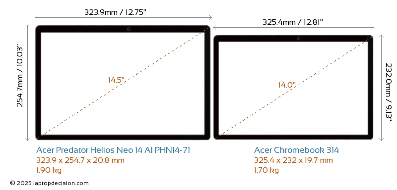 USBBoth Predator Helios Neo 14 AI PHN14-71 and Chromebook 314 have USB-A ports. Predator Helios Neo 14 AI PHN14-71 has 2x USB 3.2 USB-A ports, while Chromebook 314 has 2x USB 3.0 USB-A ports.Both Predator Helios Neo 14 AI PHN14-71 and Chromebook 314 have USB Type-C ports. Predator Helios Neo 14 AI PHN14-71 has 2x USB 3.2 USB Type-C ports, while Chromebook 314 has 2x USB 3.1 USB Type-C ports.