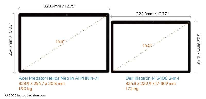 HDMIBoth Predator Helios Neo 14 AI PHN14-71 and Inspiron 14 5406 2-in-1 feature an HDMI port. Predator Helios Neo 14 AI PHN14-71 offers 1x HDMI 2.1, while Inspiron 14 5406 2-in-1 offers 1x HDMI 1.4.