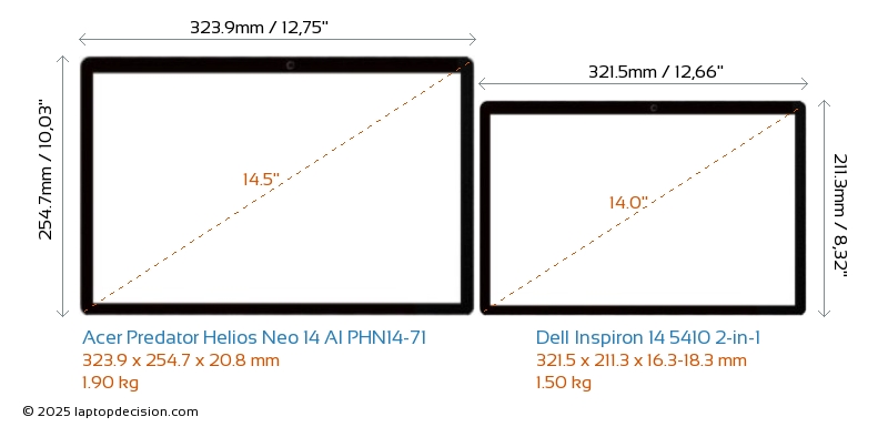 HDMIBoth Predator Helios Neo 14 AI PHN14-71 and Inspiron 14 5410 2-in-1 feature an HDMI port. Predator Helios Neo 14 AI PHN14-71 offers 1x HDMI 2.1, while Inspiron 14 5410 2-in-1 offers 1x HDMI 1.4.