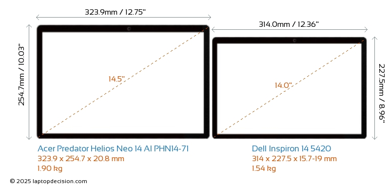 HDMIBoth Predator Helios Neo 14 AI PHN14-71 and Inspiron 14 5420 feature an HDMI port. Predator Helios Neo 14 AI PHN14-71 offers 1x HDMI 2.1, while Inspiron 14 5420 offers 1x HDMI 1.4.