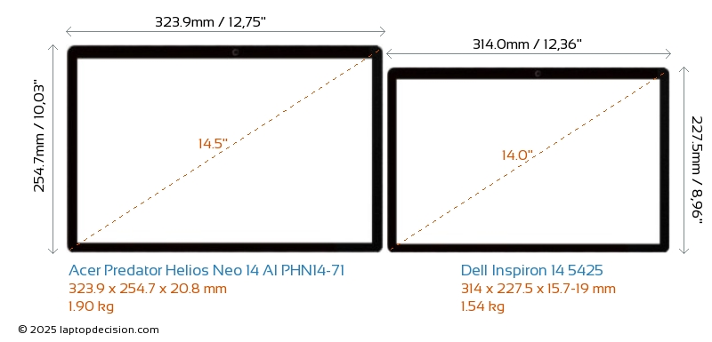 HDMIBoth Predator Helios Neo 14 AI PHN14-71 and Inspiron 14 5425 feature an HDMI port. Predator Helios Neo 14 AI PHN14-71 offers 1x HDMI 2.1, while Inspiron 14 5425 offers 1x HDMI 1.4.