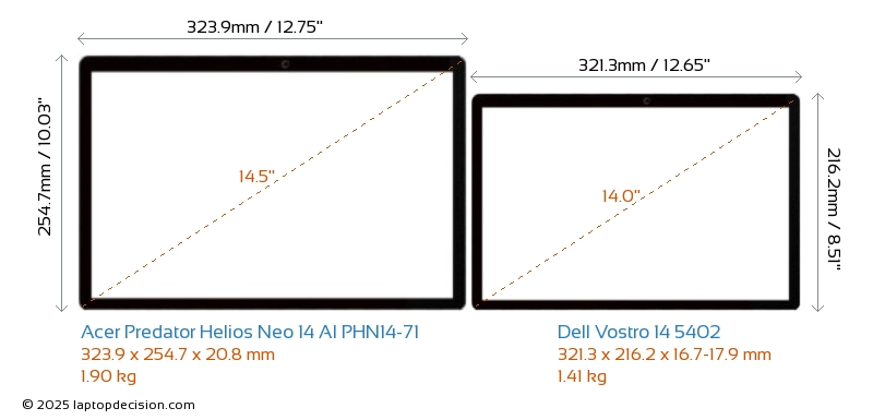 HDMIBoth Predator Helios Neo 14 AI PHN14-71 and Vostro 14 5402 feature an HDMI port. Predator Helios Neo 14 AI PHN14-71 offers 1x HDMI 2.1, while Vostro 14 5402 offers 1x HDMI 1.4.
