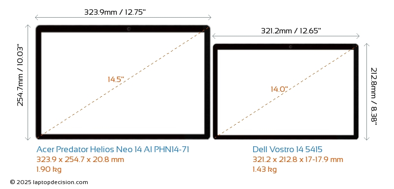 HDMIBoth Predator Helios Neo 14 AI PHN14-71 and Vostro 14 5415 feature an HDMI port. Predator Helios Neo 14 AI PHN14-71 offers 1x HDMI 2.1, while Vostro 14 5415 offers 1x HDMI 1.4.