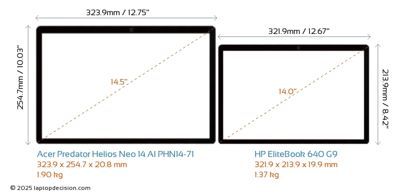 USBBoth Predator Helios Neo 14 AI PHN14-71 and EliteBook 640 G9 have USB-A ports. Predator Helios Neo 14 AI PHN14-71 has 2x USB 3.2 USB-A ports, while EliteBook 640 G9 has 3x USB 3.2 USB-A ports.Both Predator Helios Neo 14 AI PHN14-71 and EliteBook 640 G9 have USB Type-C ports. Predator Helios Neo 14 AI PHN14-71 has 2x USB 3.2 USB Type-C ports, while EliteBook 640 G9 has 1x USB 4.0 USB Type-C ports.