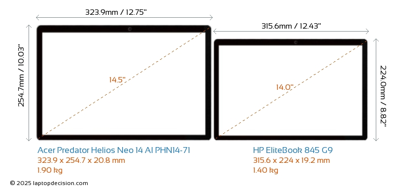 HDMIBoth Predator Helios Neo 14 AI PHN14-71 and EliteBook 845 G9 feature an HDMI port. Predator Helios Neo 14 AI PHN14-71 offers 1x HDMI 2.1, while EliteBook 845 G9 offers 1x HDMI 2.0.