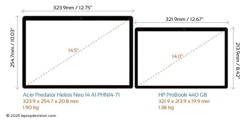 HDMIBoth Predator Helios Neo 14 AI PHN14-71 and ProBook 440 G8 feature an HDMI port. Predator Helios Neo 14 AI PHN14-71 offers 1x HDMI 2.1, while ProBook 440 G8 offers 1x HDMI 1.4.