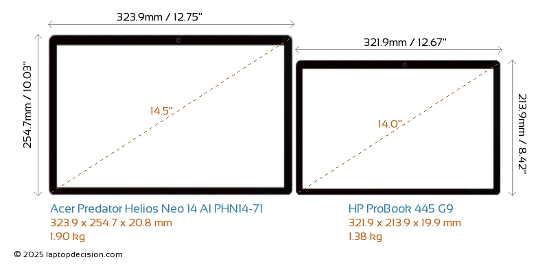 USBBoth Predator Helios Neo 14 AI PHN14-71 and ProBook 445 G9 have USB-A ports. Predator Helios Neo 14 AI PHN14-71 has 2x USB 3.2 USB-A ports, while ProBook 445 G9 has 3x USB 3.2 USB-A ports.Both Predator Helios Neo 14 AI PHN14-71 and ProBook 445 G9 have USB Type-C ports. Predator Helios Neo 14 AI PHN14-71 has 2x USB 3.2 USB Type-C ports, while ProBook 445 G9 has 1x USB 4.0 USB Type-C ports.